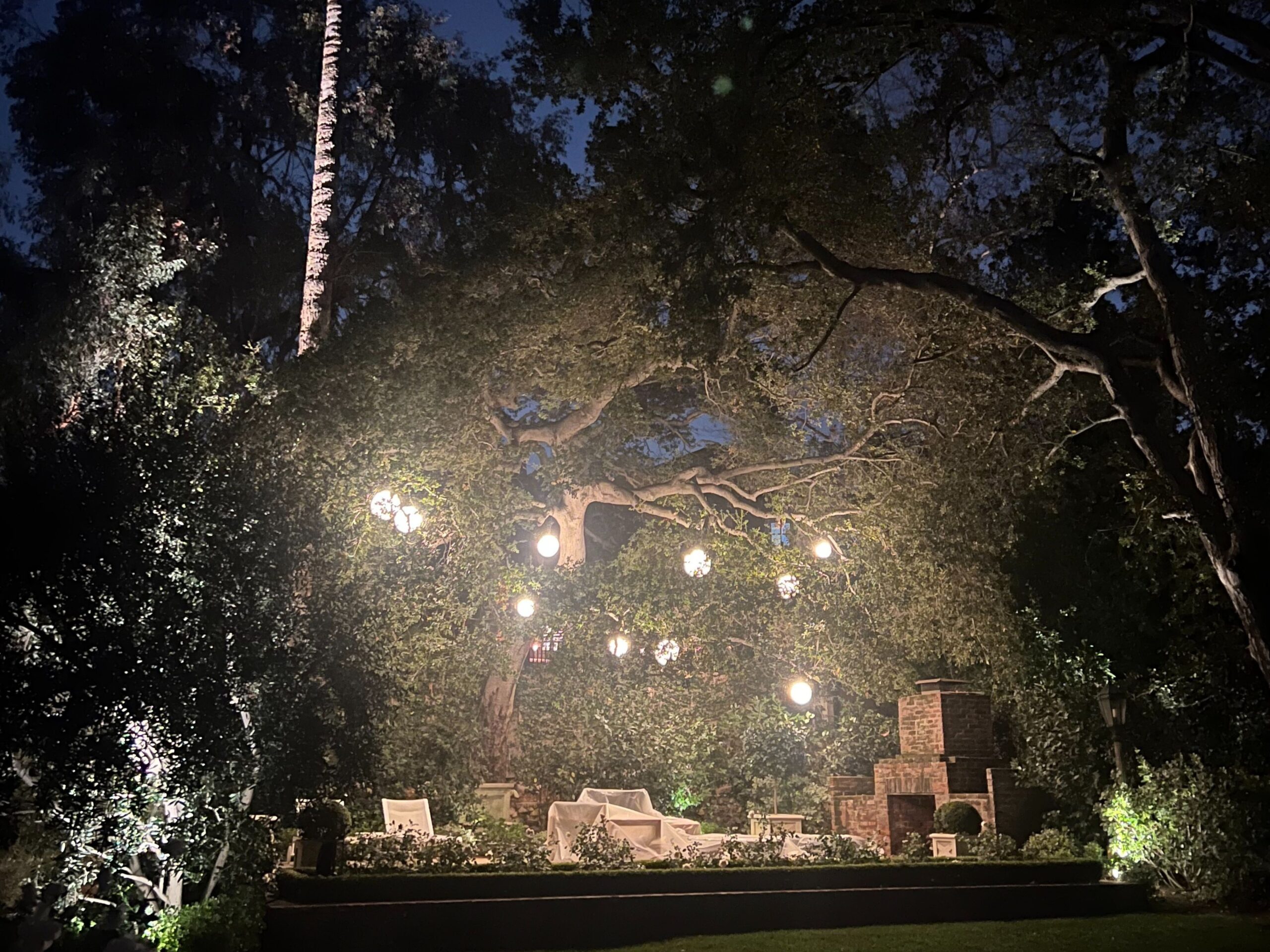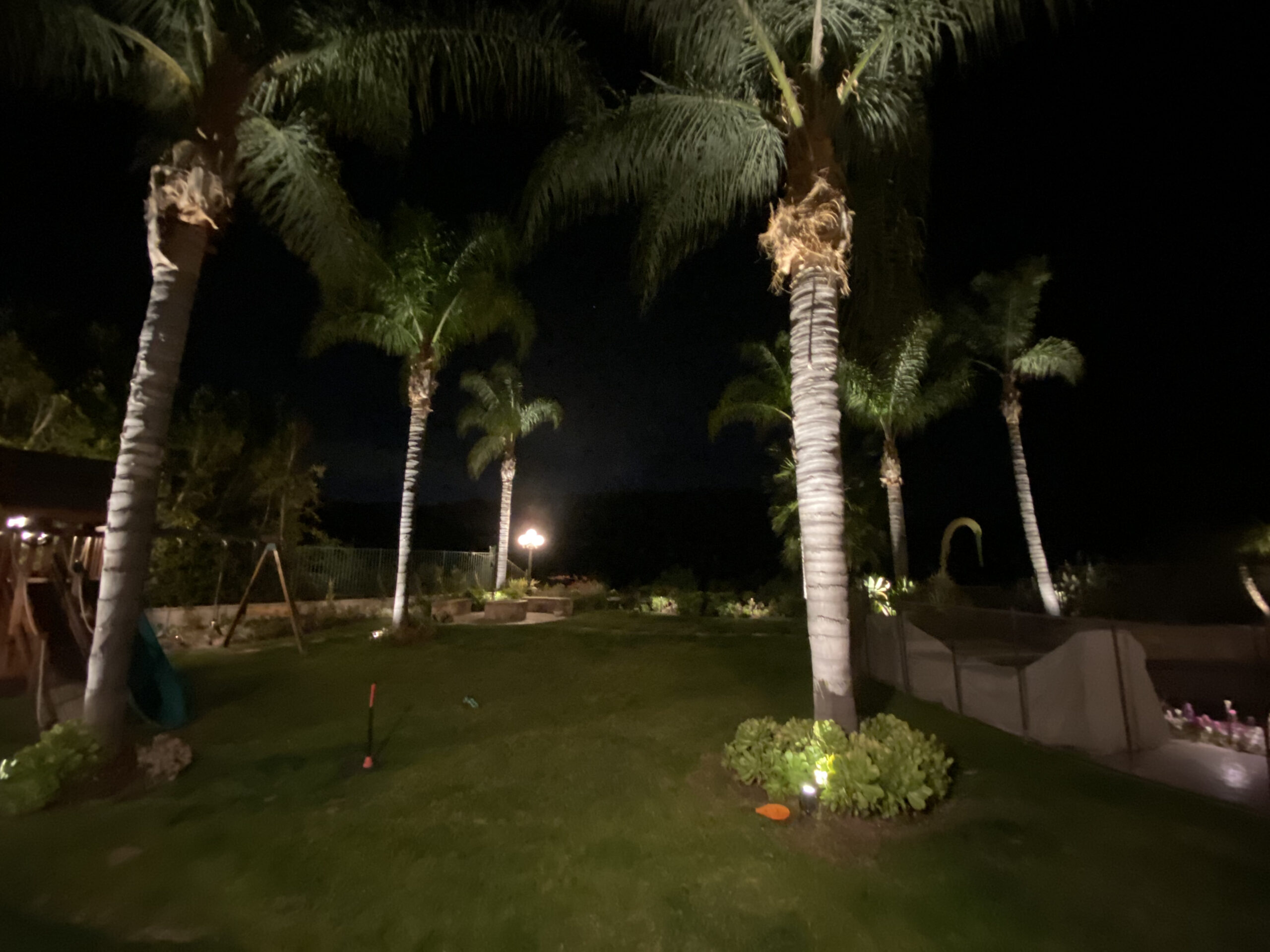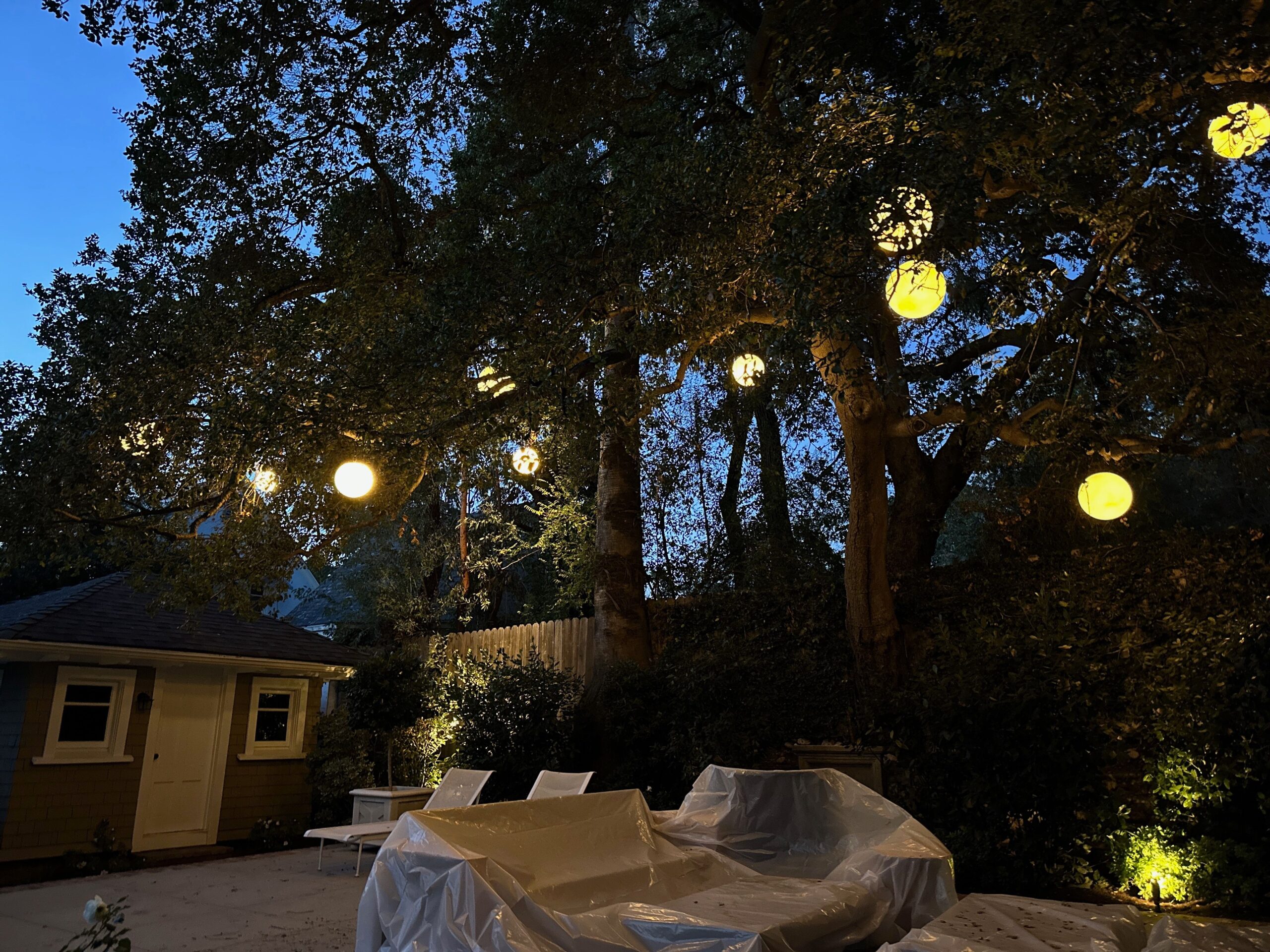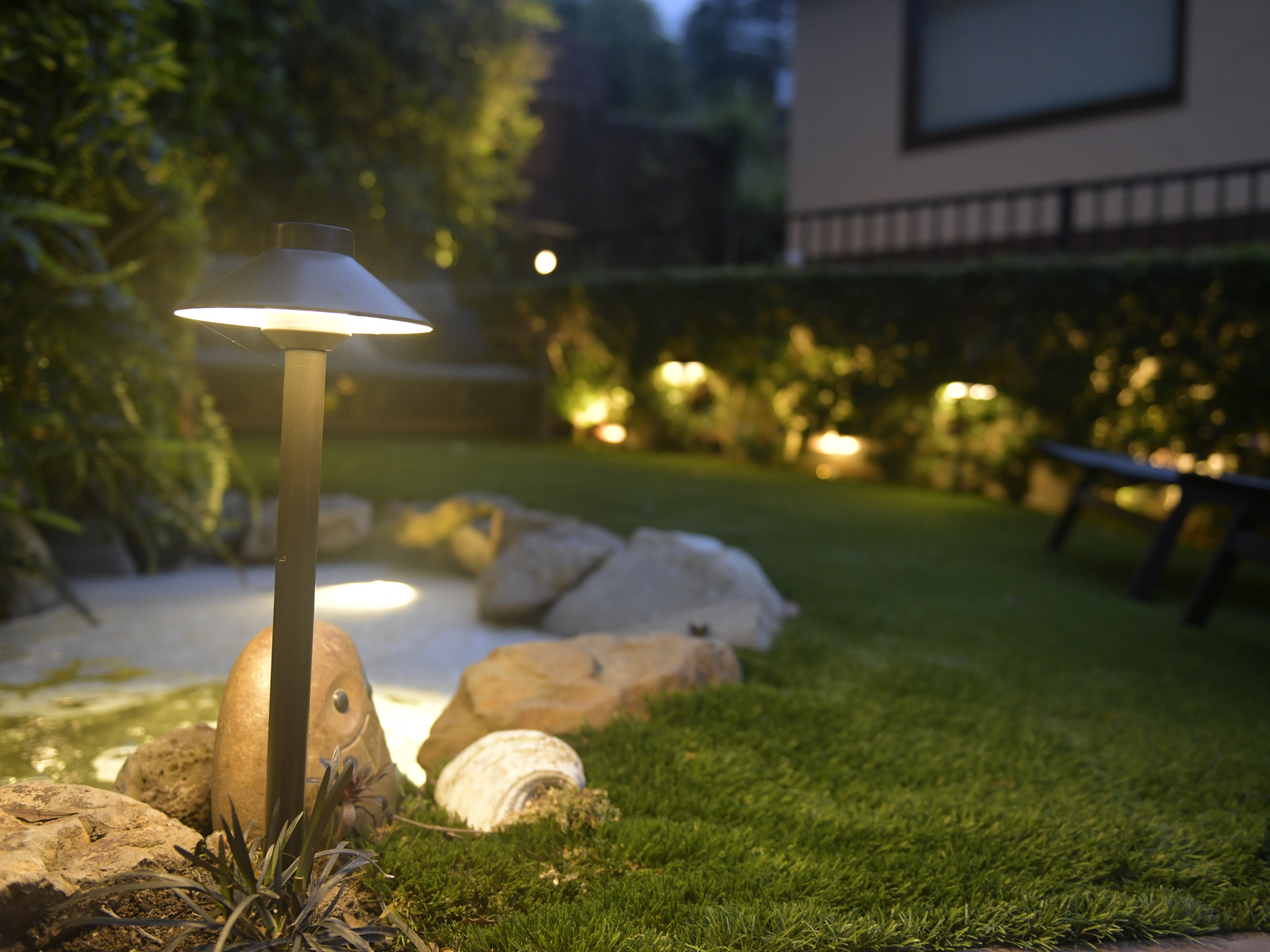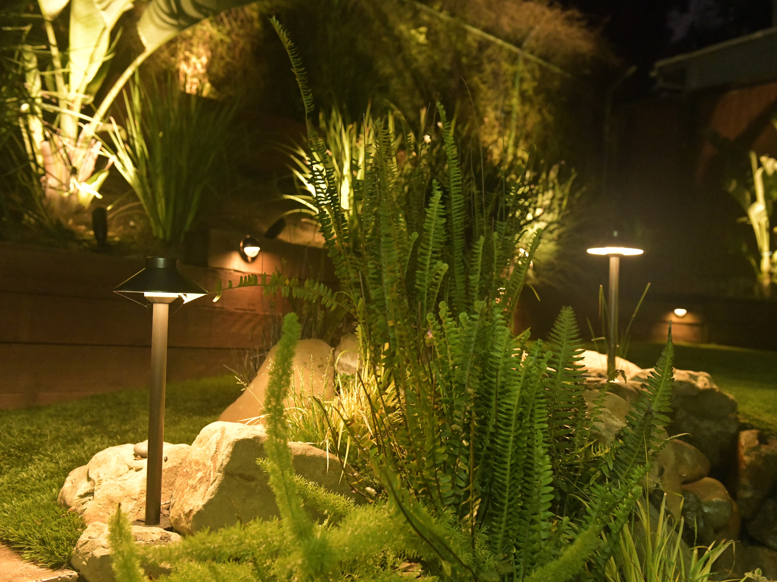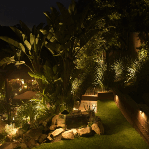 backyard illuminated with low voltage LED landscape lights