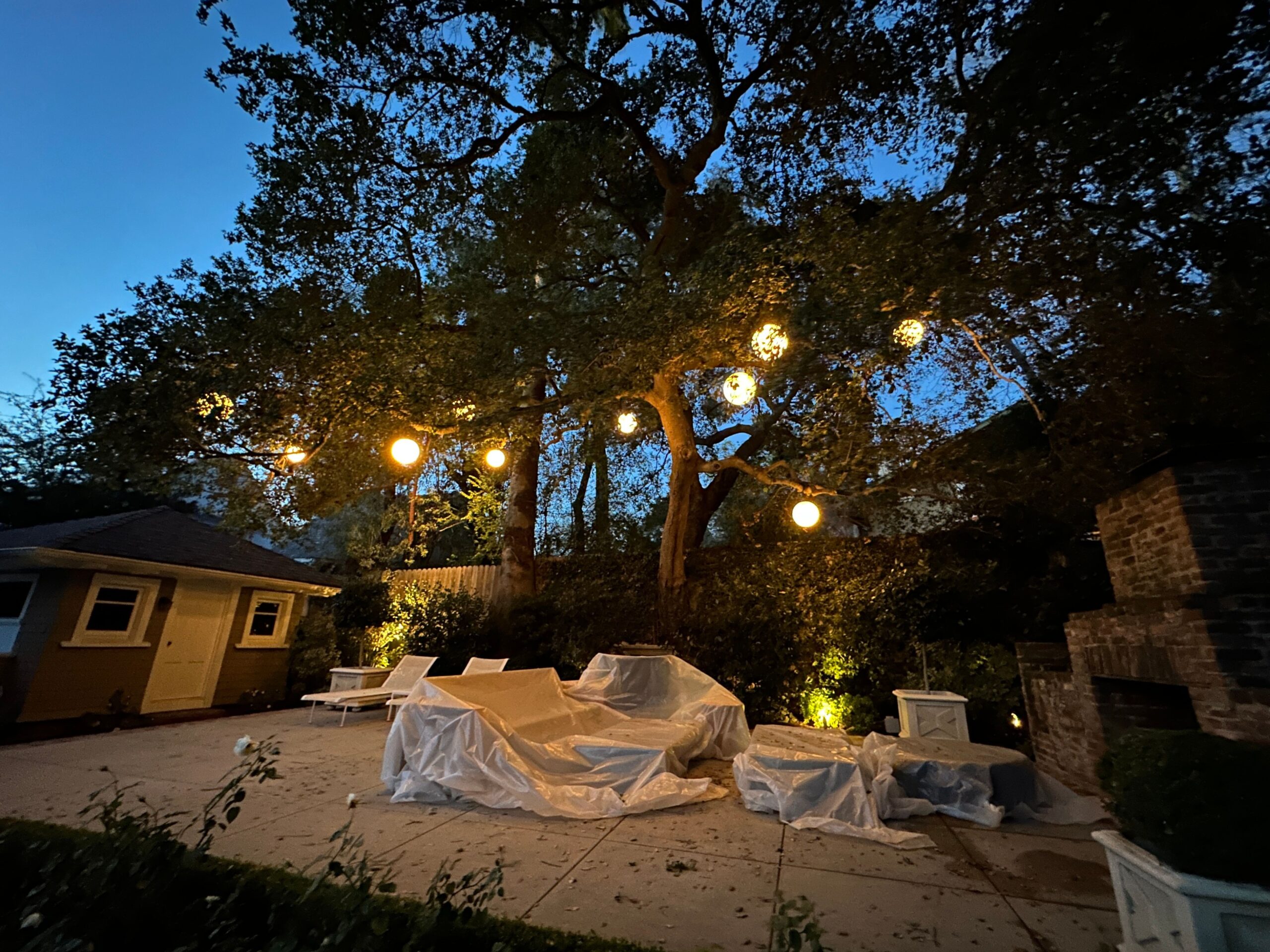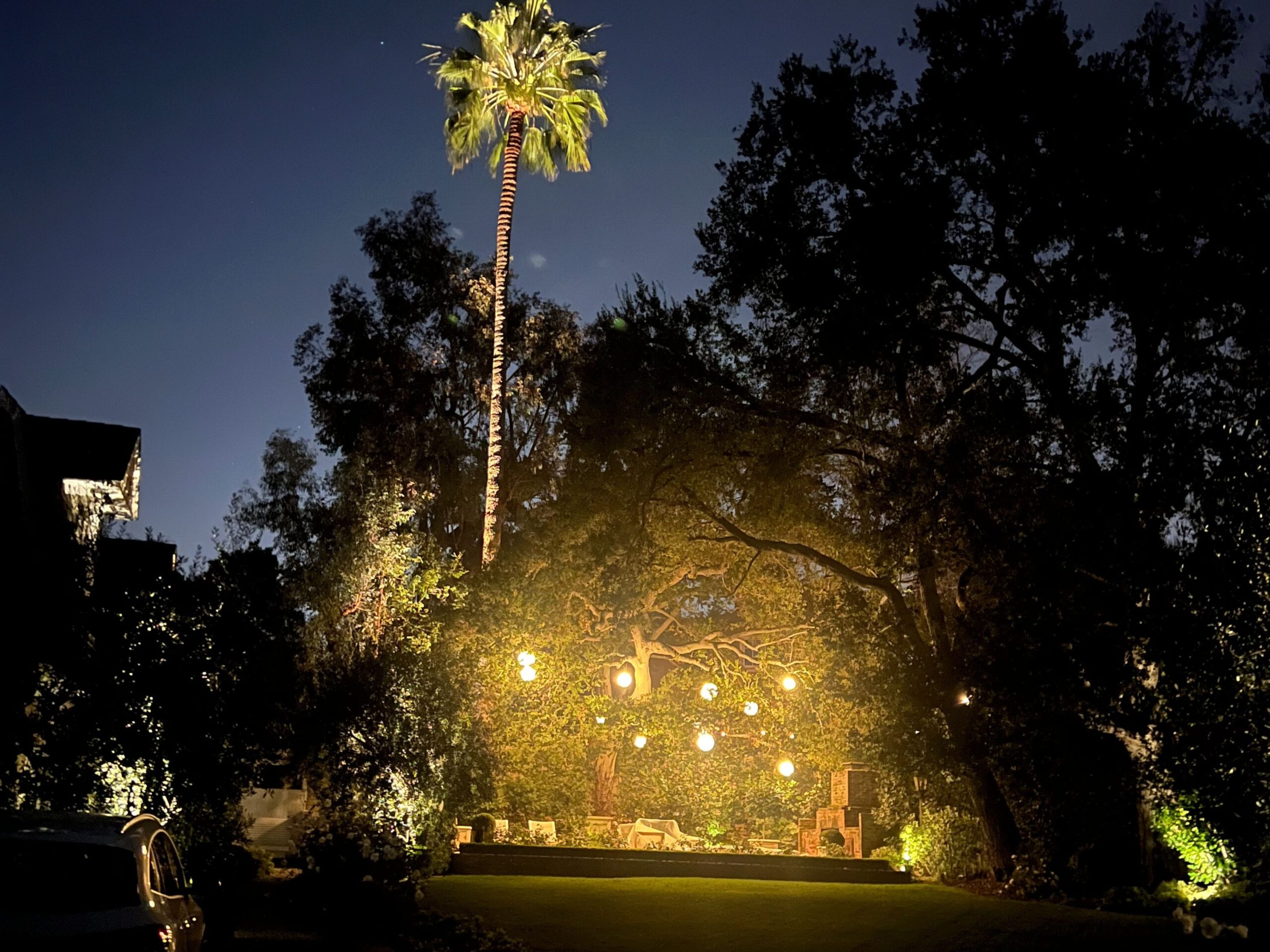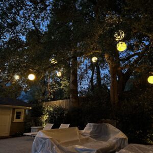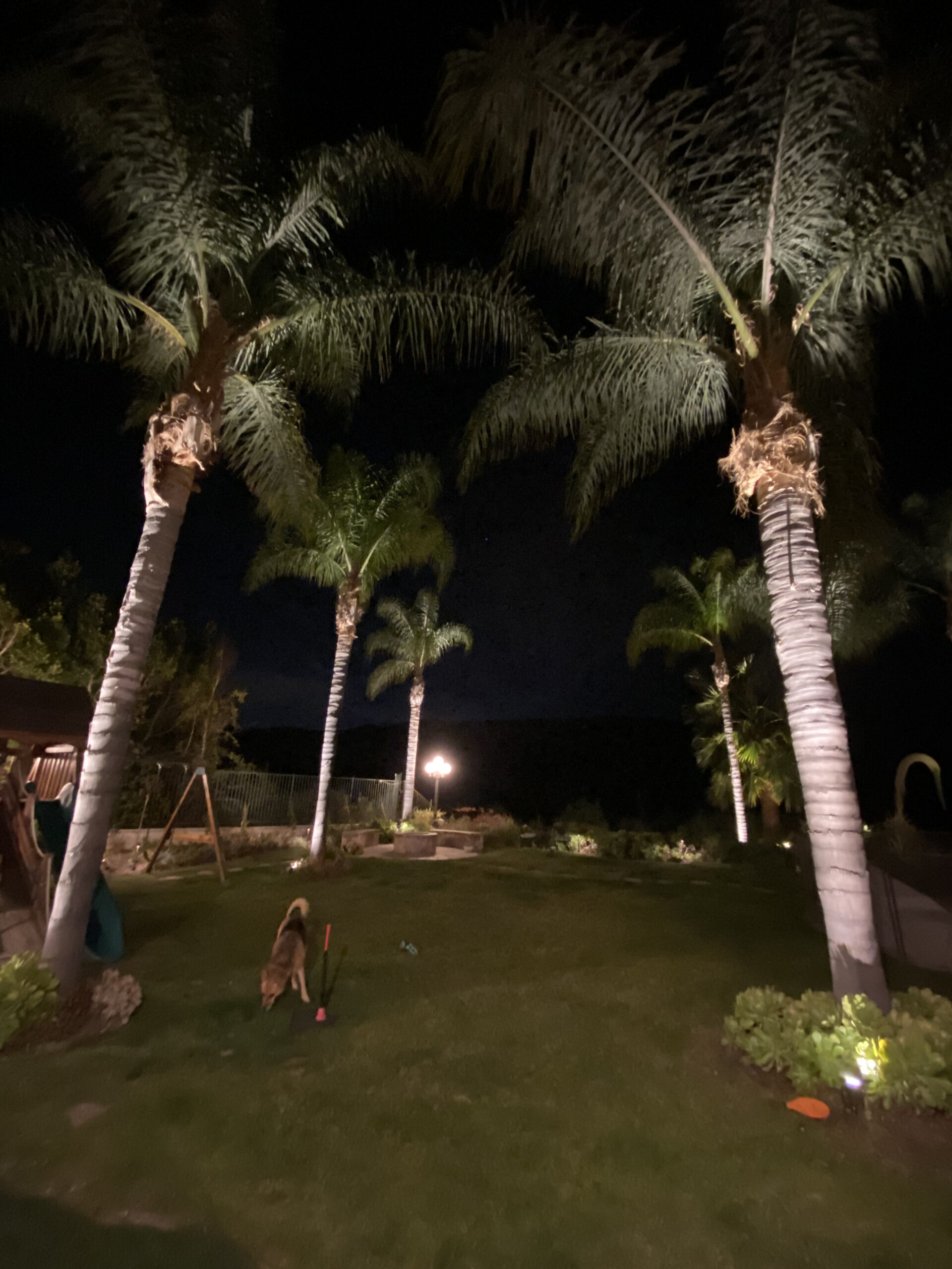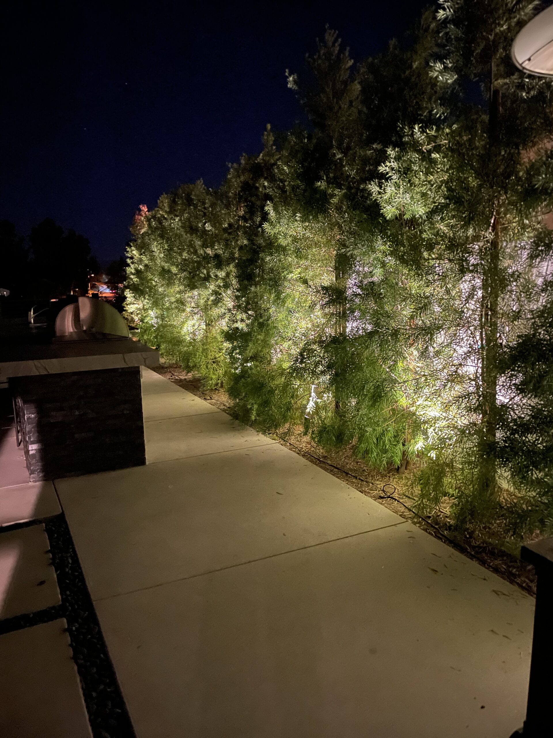 backyard illuminated with low voltage LED landscape lights