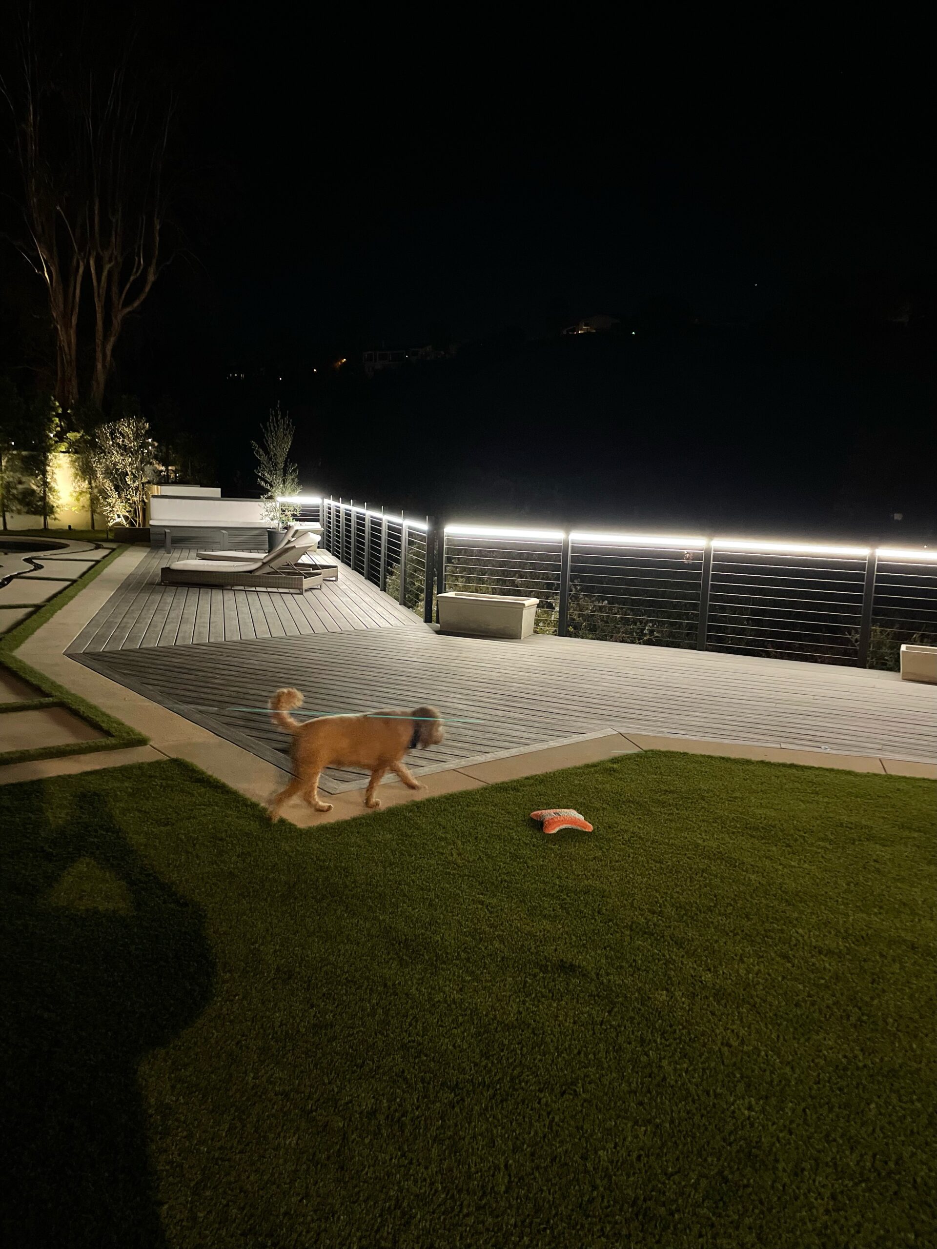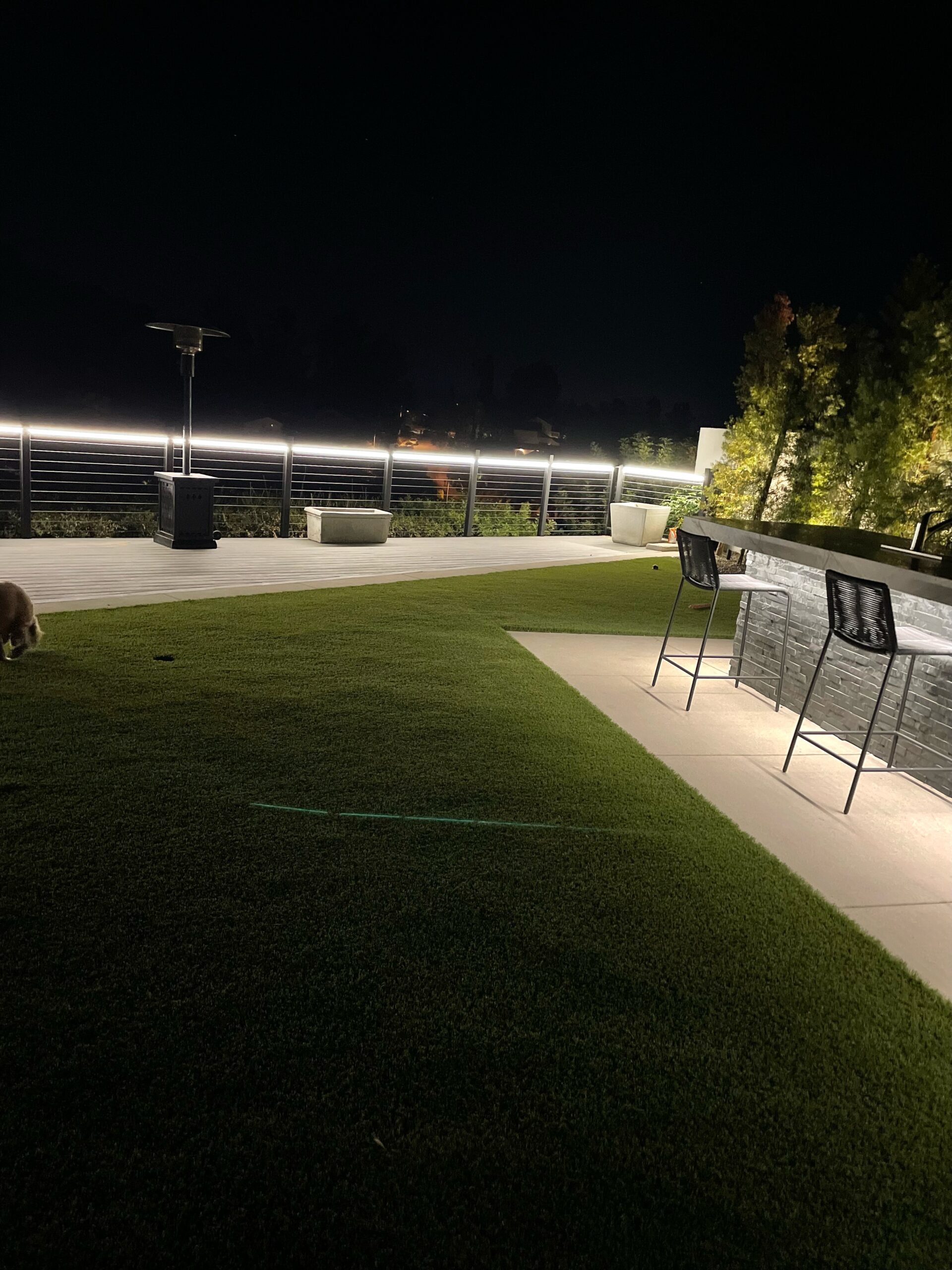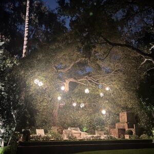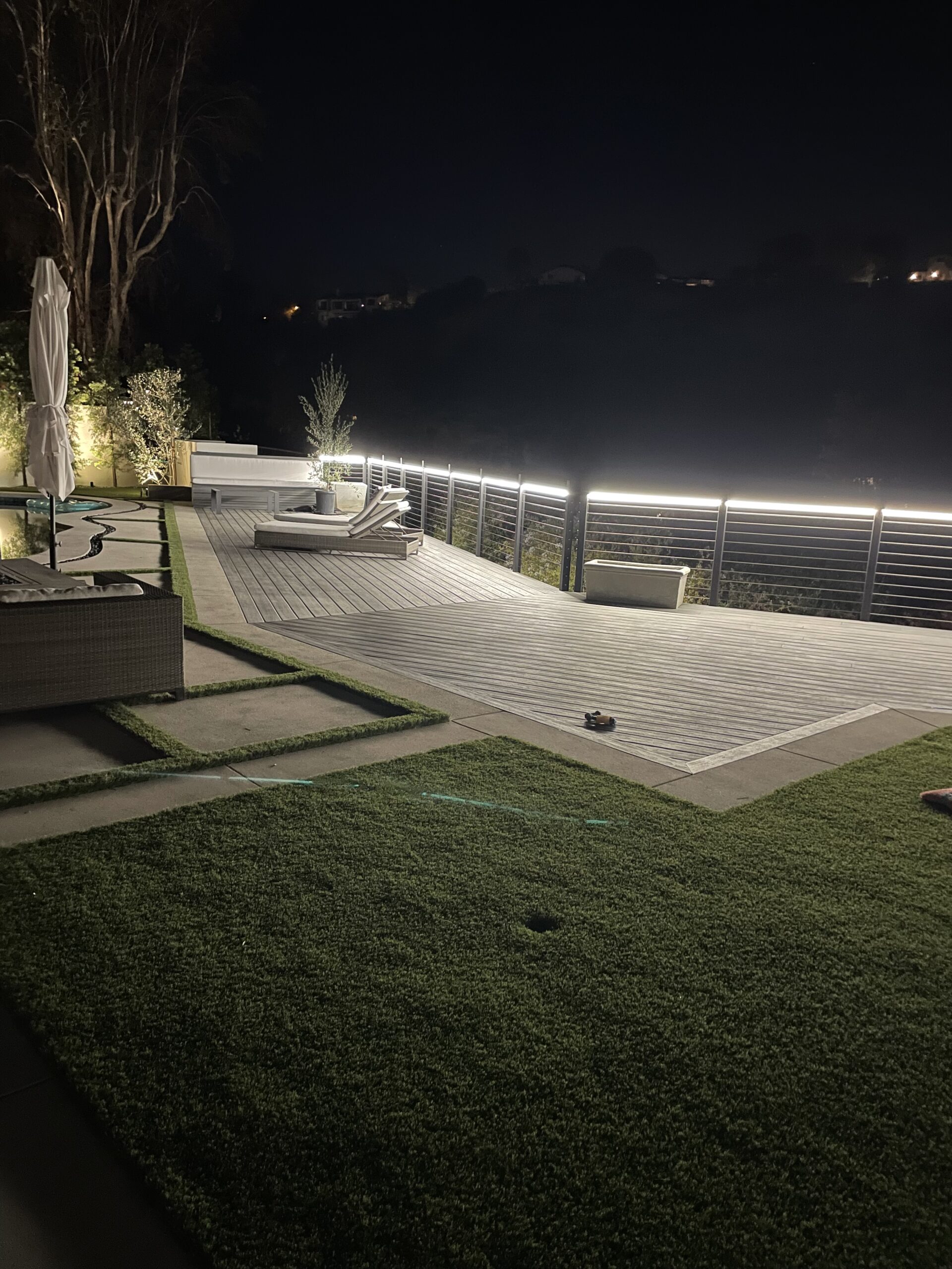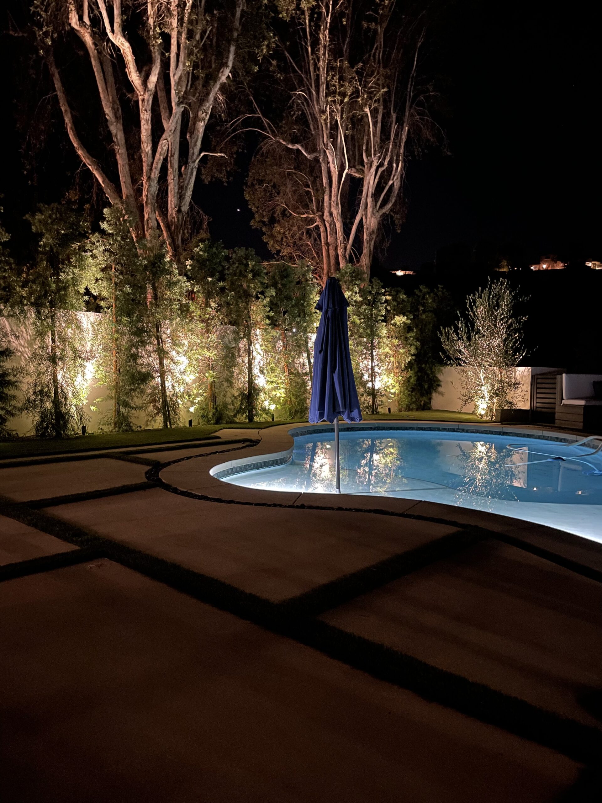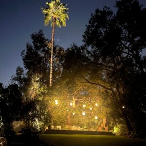 backyard illuminated with low voltage LED landscape lights