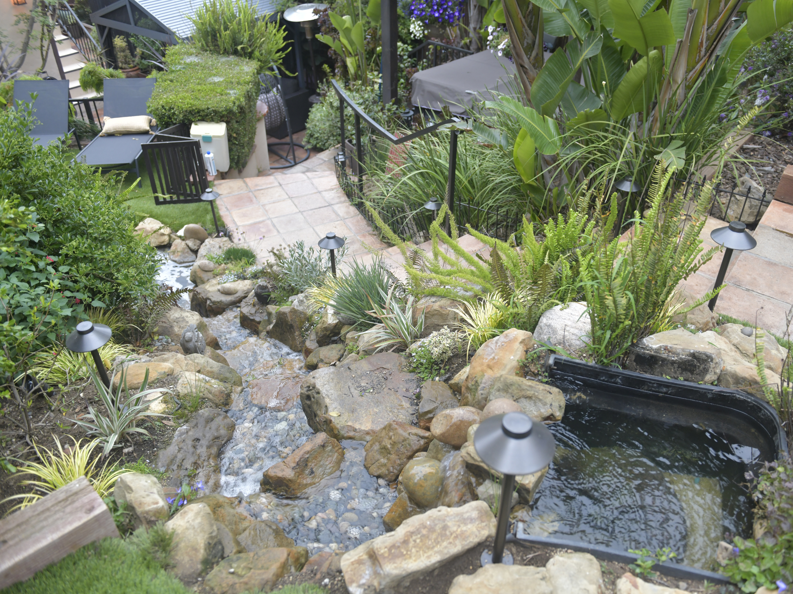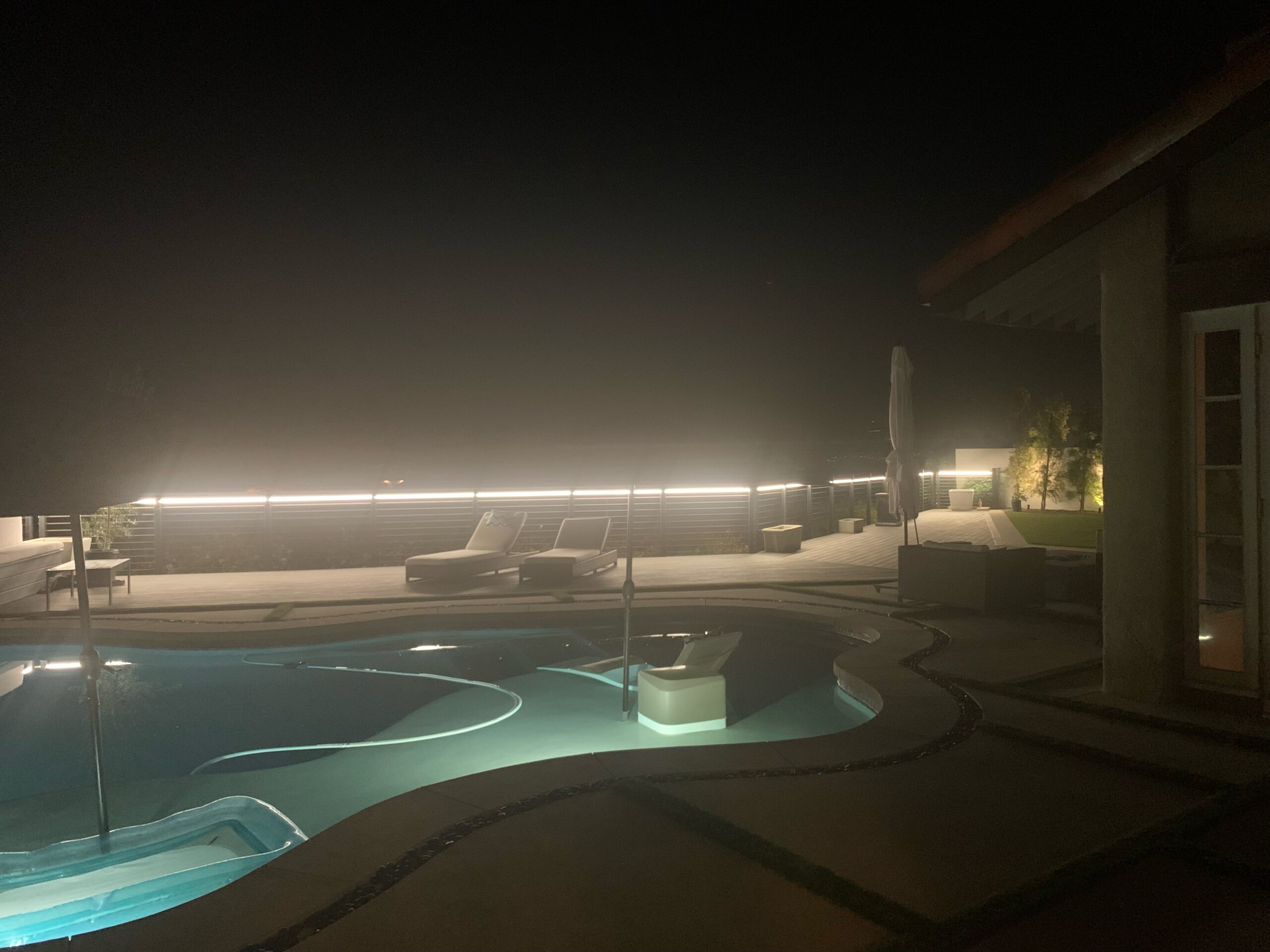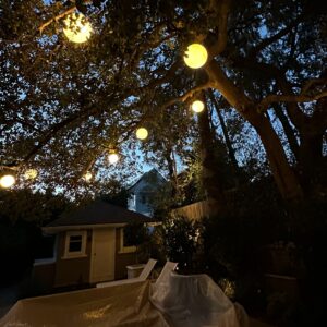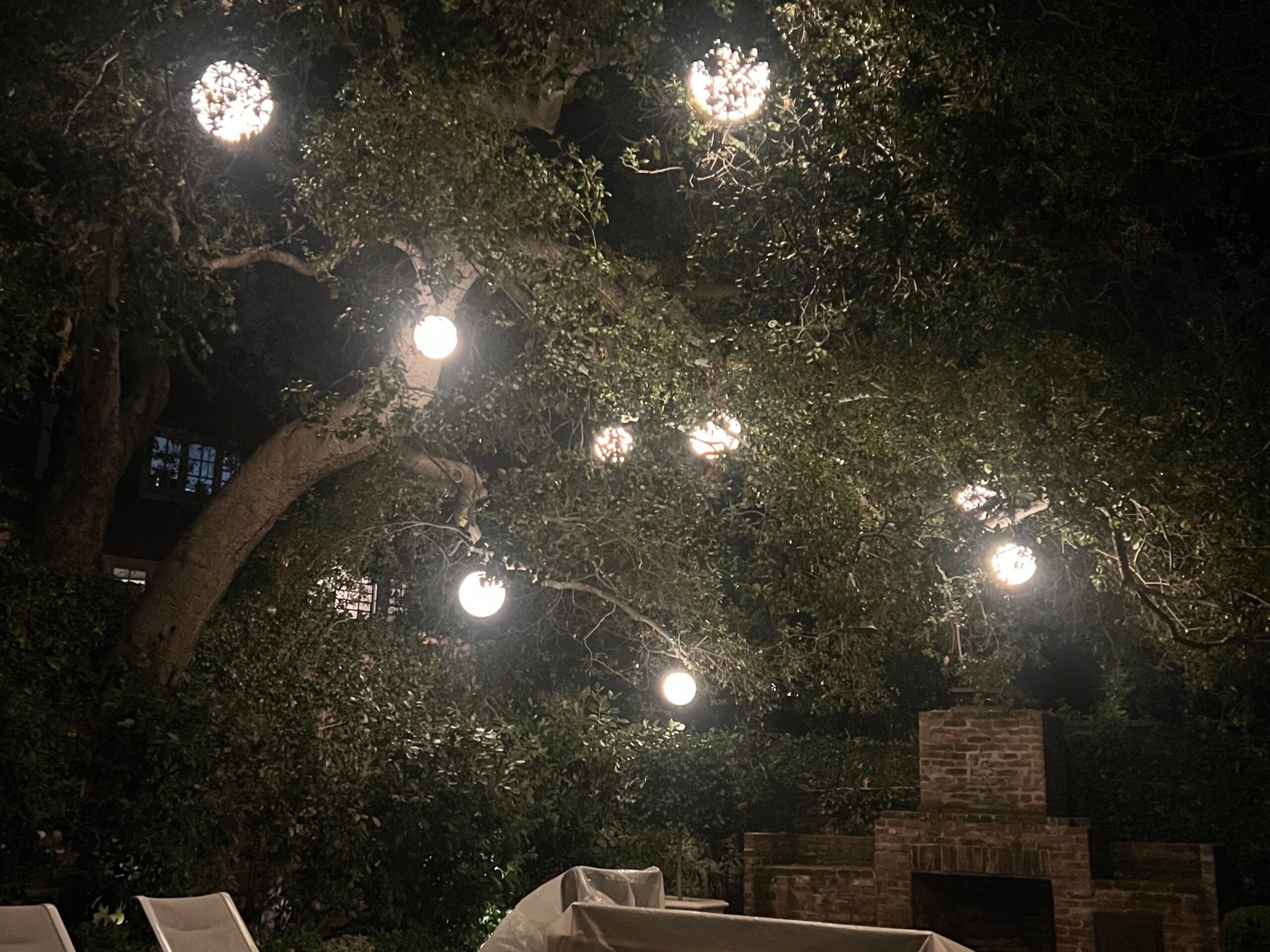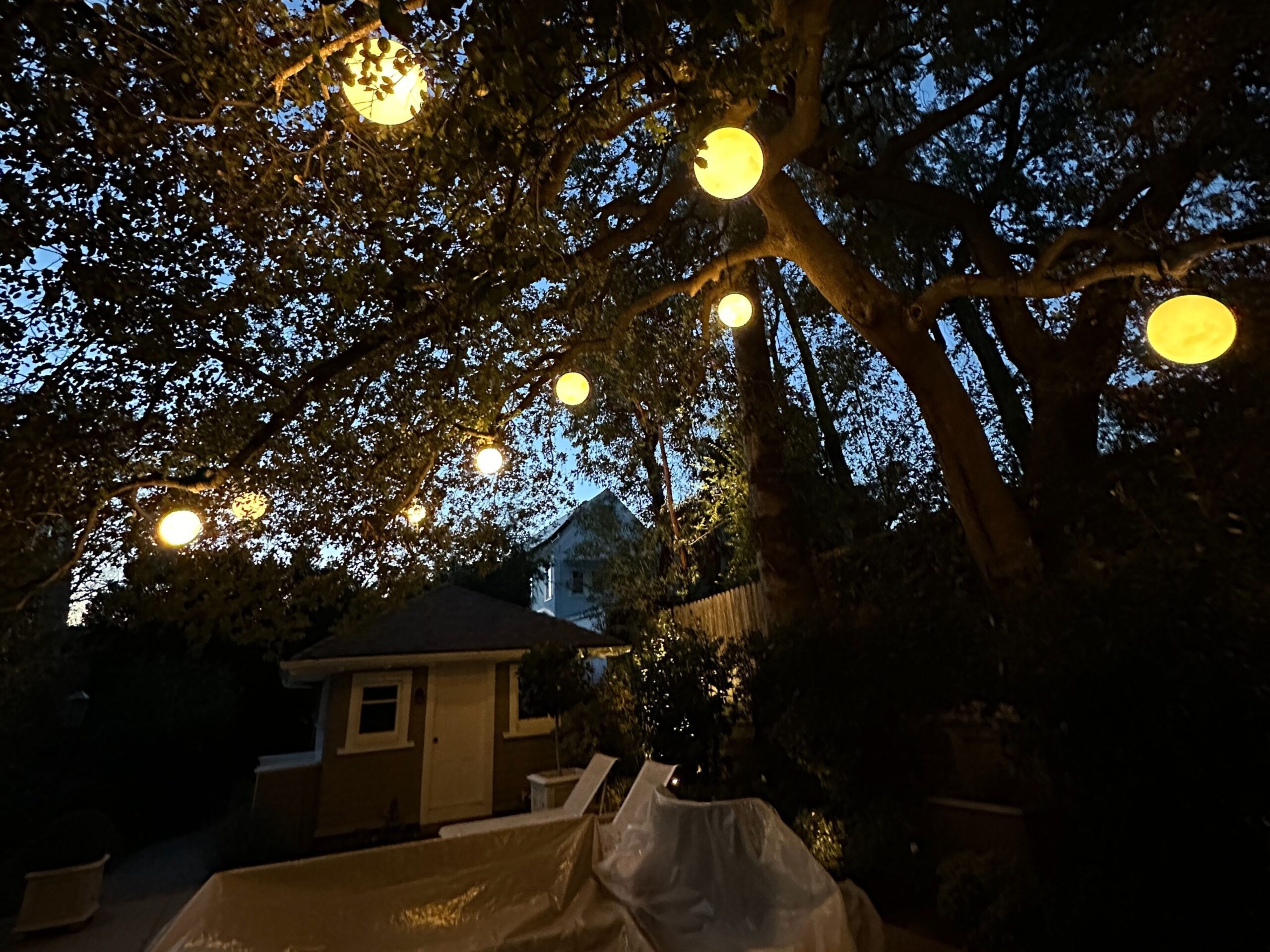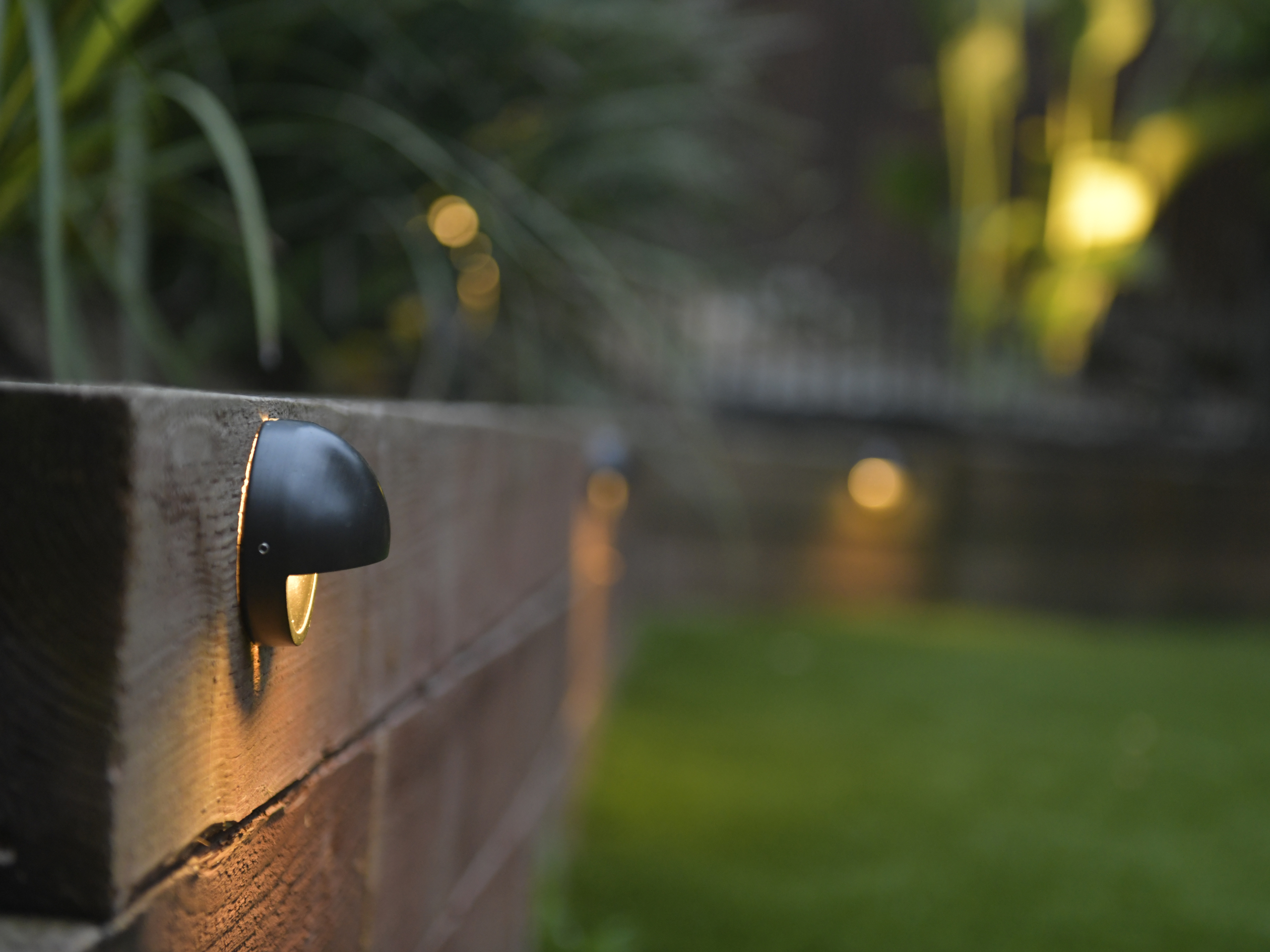backyard illuminated with low voltage LED landscape lights